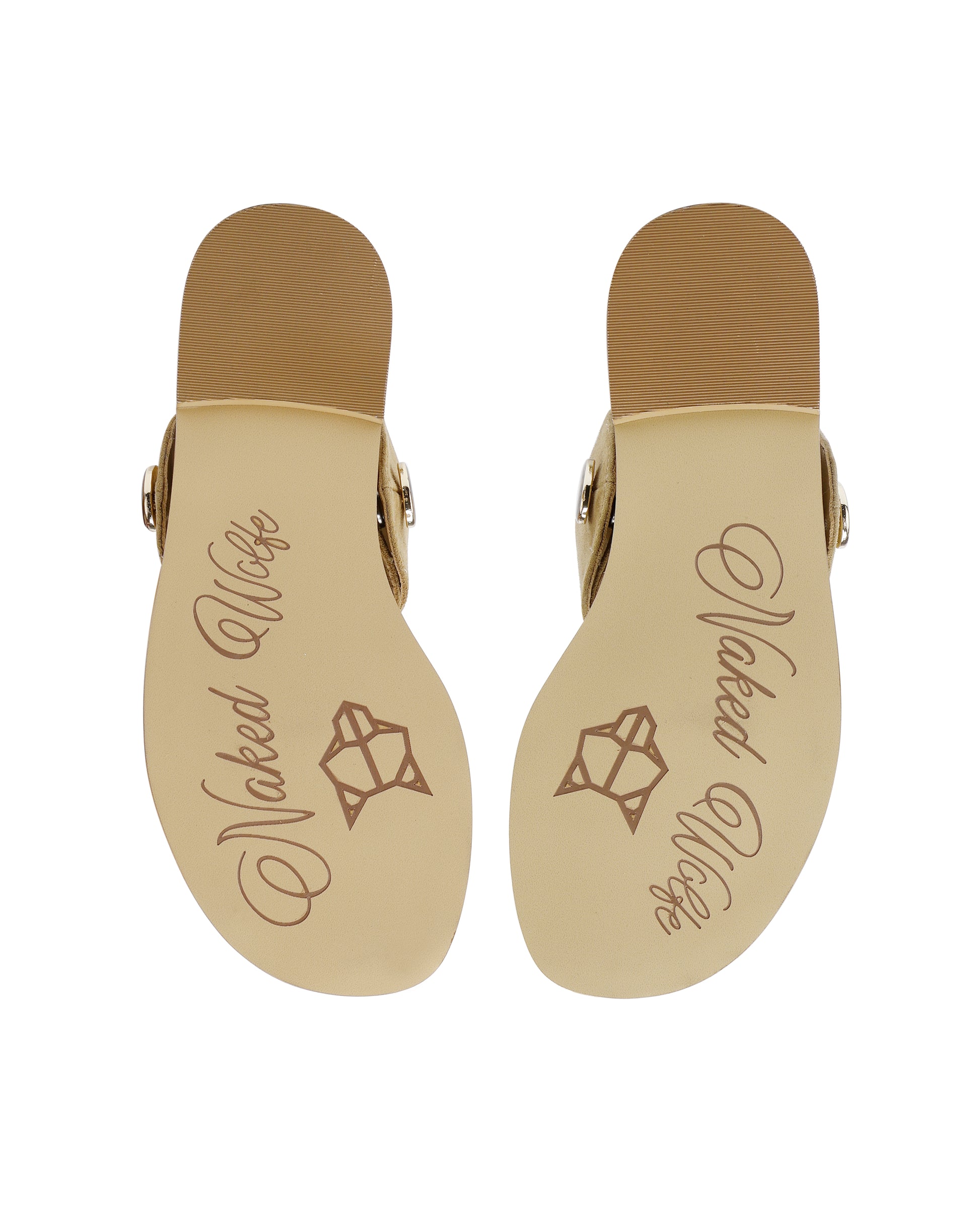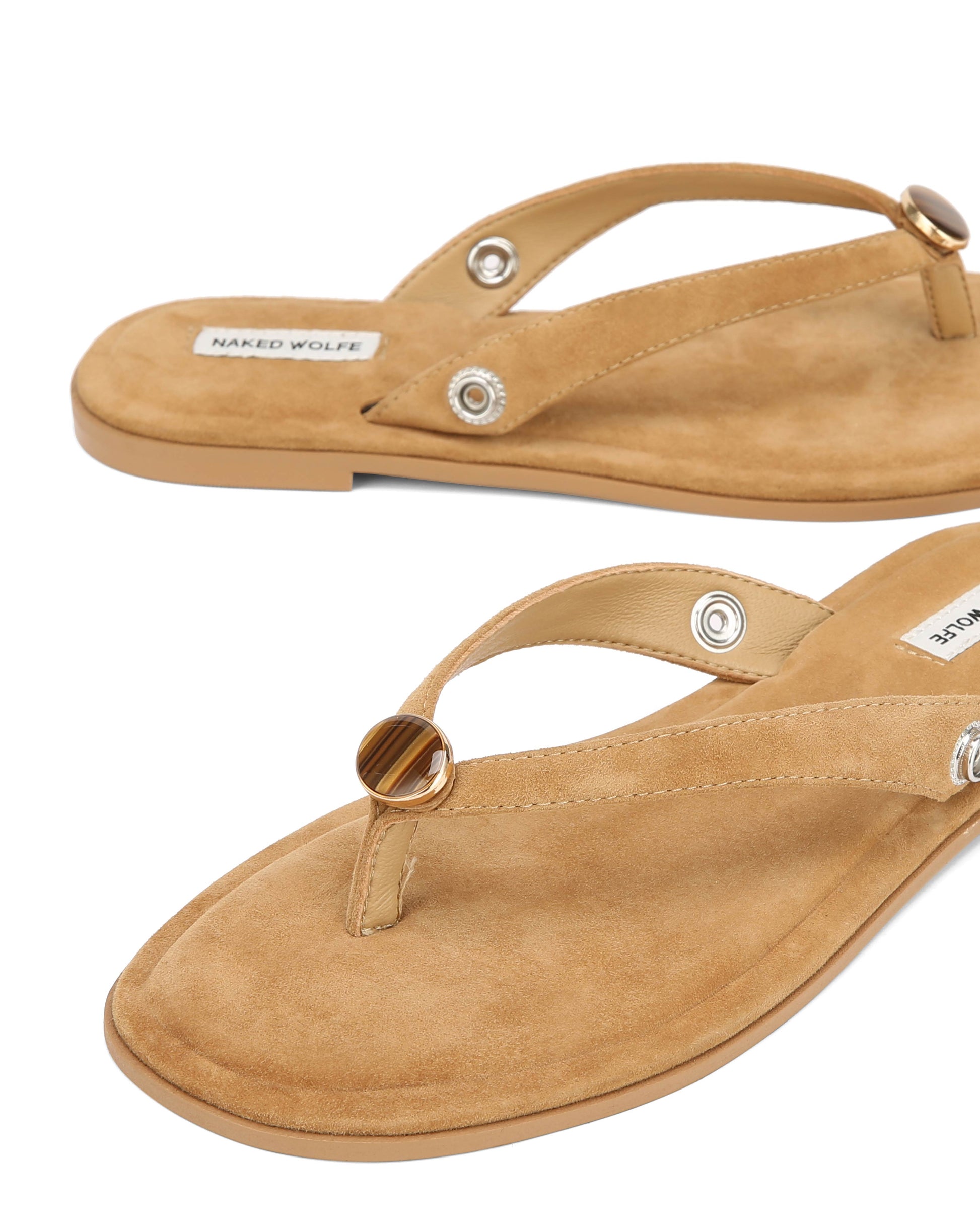 Introducing Sammy, our exquisite new sandal from the Naked Wolfe collection. Featuring a removable suede leg piece attached with poppers for versatile styling, and adorned with tiger eye stone detail. Sammy features a well cushioned insole for good wear and comfort. Crafted with premium kid suede for a luxurious touch. Elevate your wardrobe with this elegant and exclusive design.