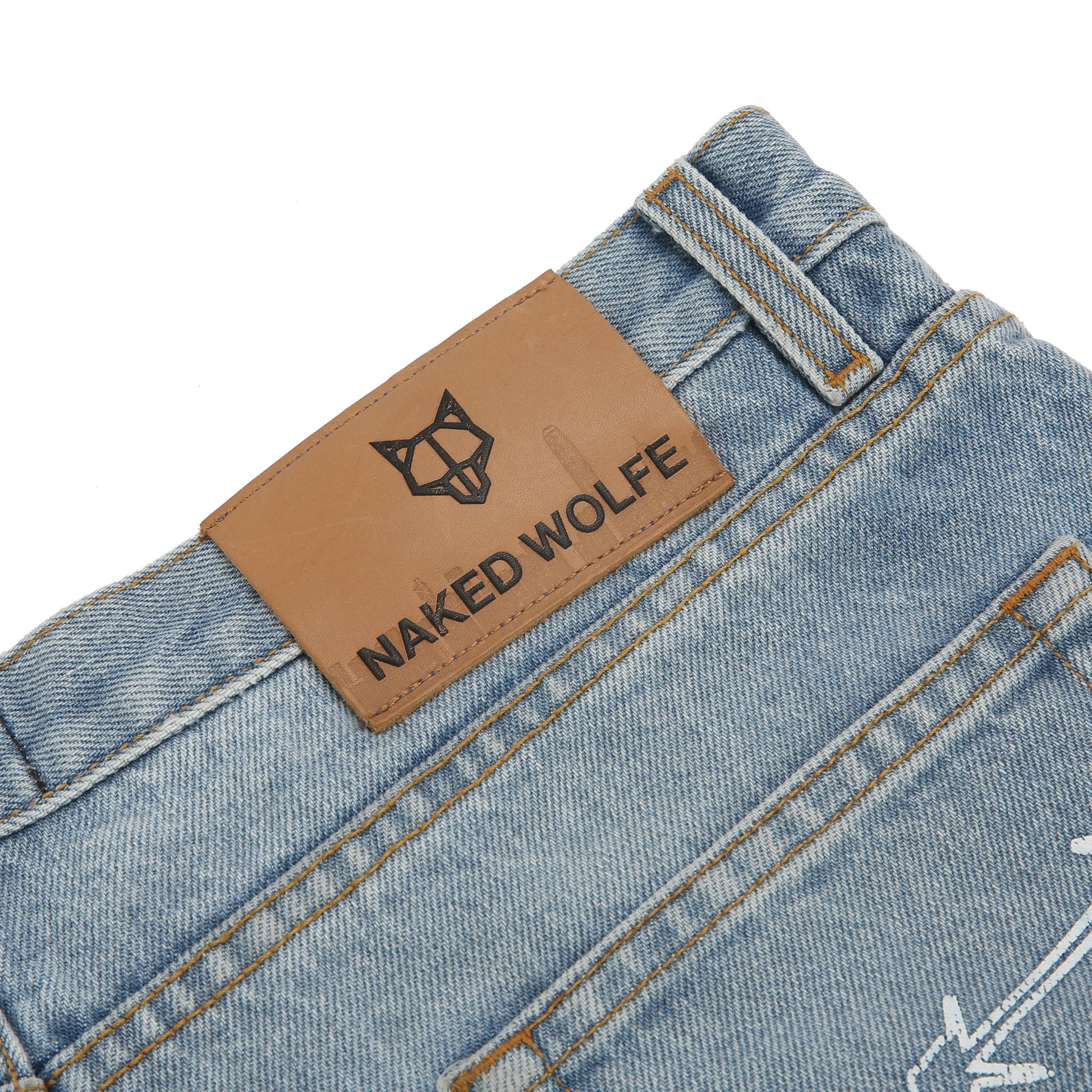 - Barbed-wire print on the back pockets and signature embroidery on the front leg