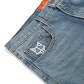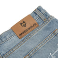 - Barbed-wire print on the back pockets and signature embroidery on the front leg