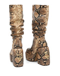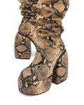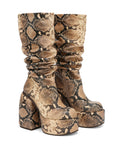 Space, the newest and most desirable scrunch boot. Space is based on a show stopping exaggerated round toe shape. Made from the finest Snake print leather, this boot is not one to be missed. Space features an inside leg zip to ensure a perfect fit. Space is made up of a padded platform and heel which embeds the iconic Naked Wolfe wolfe head plaque.