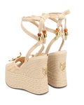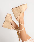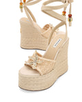Sunkissed, our brand new summer wedge with a 3d printed upper and custom starfish metal feature perfectly completes any summer look. This upper is made of super soft woven materials and a comfortable soft leg tie. The platform is wrapped in a natural espadrille rope, featuring the famous wolfe head plaque on the heel.