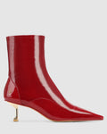 Introducing Tempting. Make a statement with our Tight Ankle Boot in Crinkle Red Patent Leather. Featuring a sleek 5cm heel and a pointed toe, these bold boots combine high fashion with a vibrant finish. The crinkle effect adds a unique texture, while the snug fit around the ankle ensures a chic silhouette. Perfect for adding a pop of color to any outfit, these boots are both eye-catching and stylish.