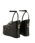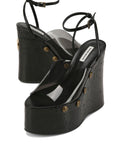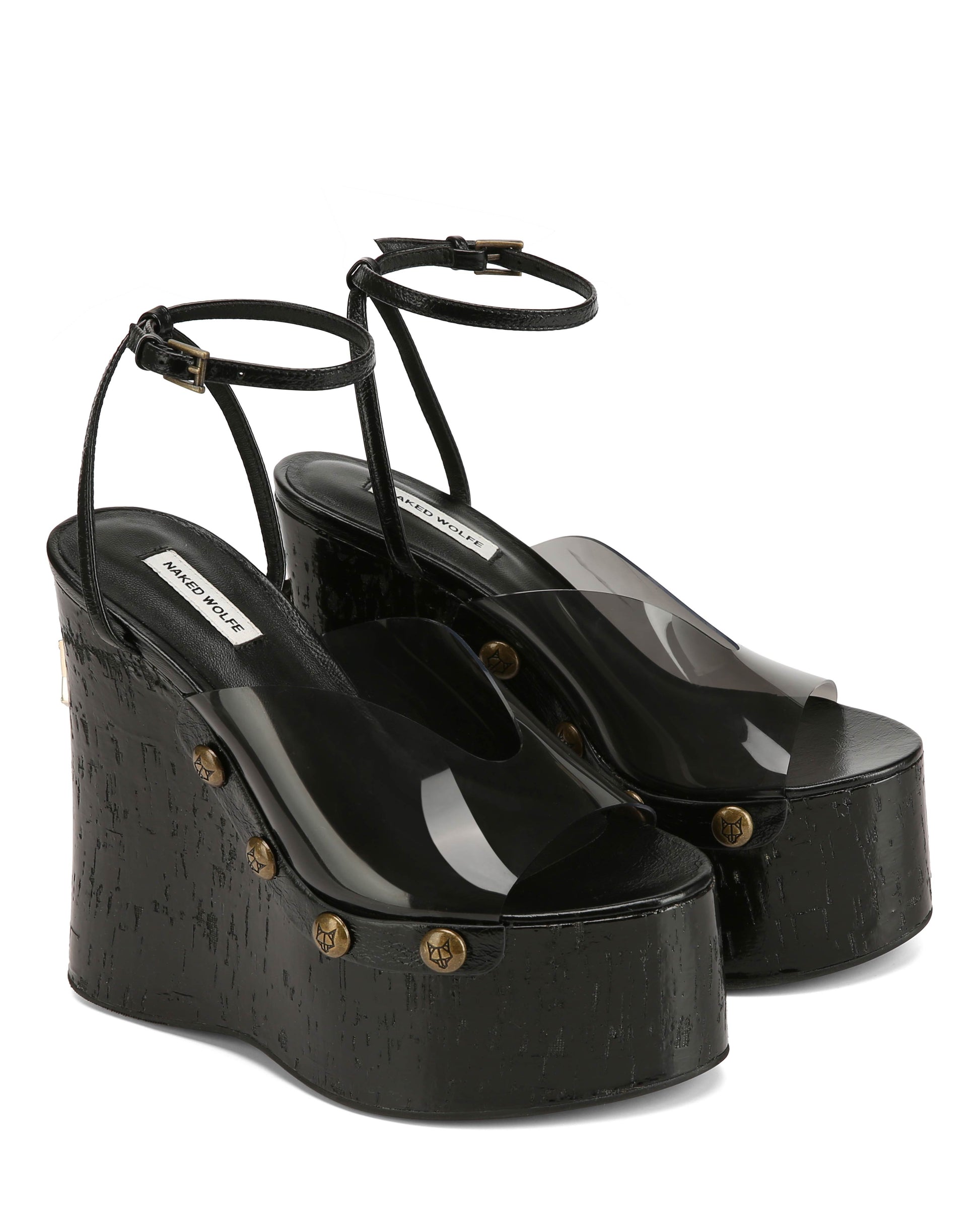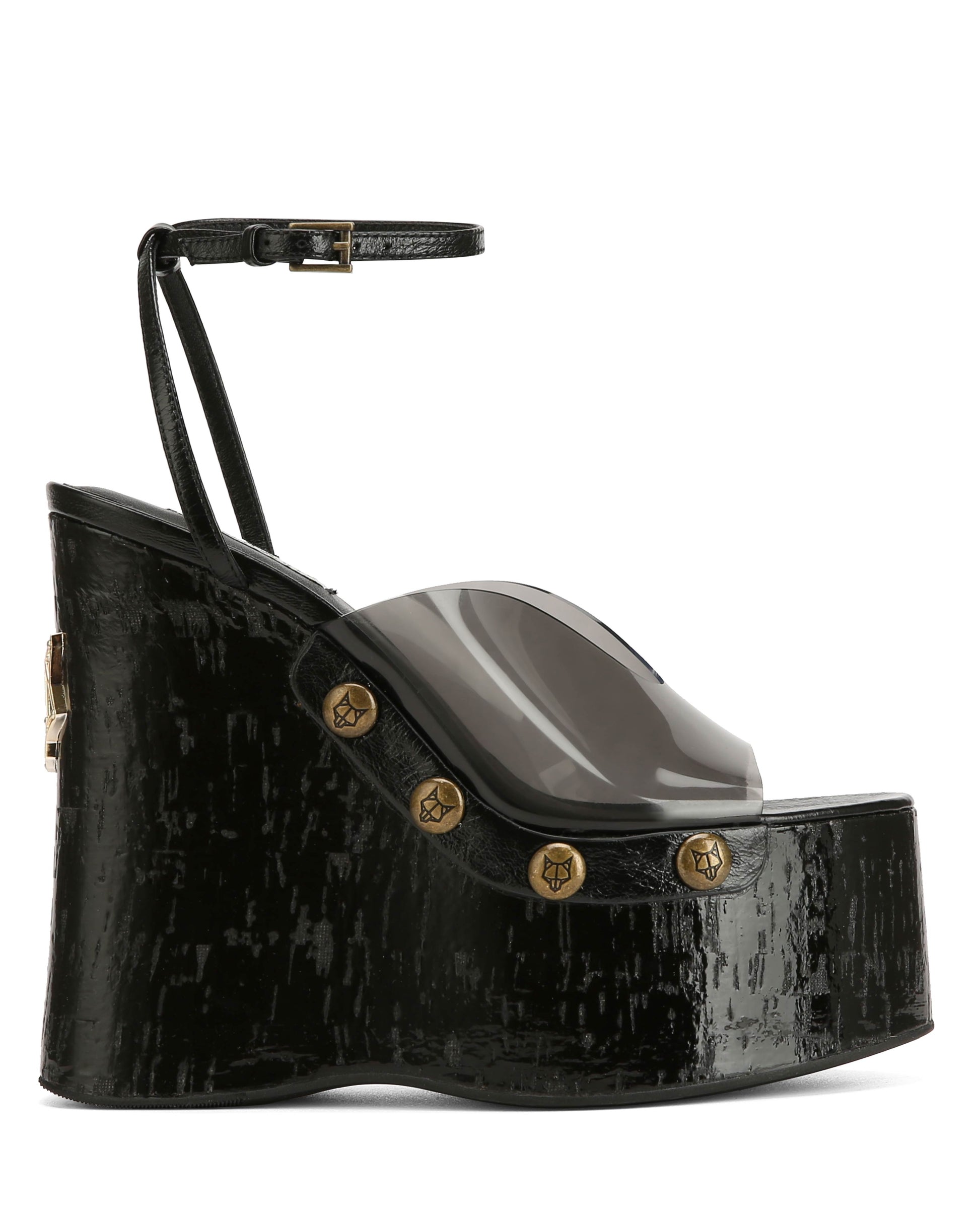 Tiger-Lilly, our brand new wedged clog heel with a peep toe design is the perfect addition to any summer look. This upper is made of top grade luxury leather and perspex. The platform is wrapped in a shiny cork wrap featuring the famous wolfe head plaque on the heel.